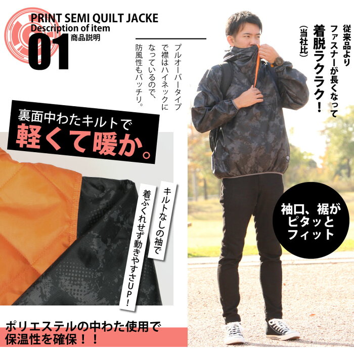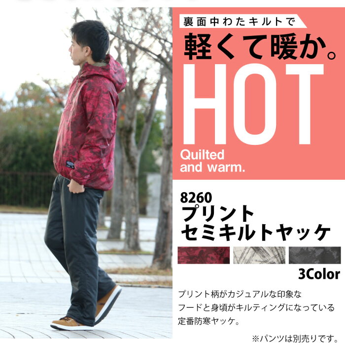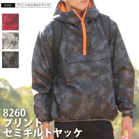 防寒着 作業服 ジャンパー アウター ブルゾン メンズ プリント 柄 かっこいい おしゃれ 中綿 キルト 作業着 農作業 上着 ジャケット 制服 仕事 仕事着 畑仕事 工場 掃除 冬用 暖かい あったかい 8260 プリントセミキルトヤッケ