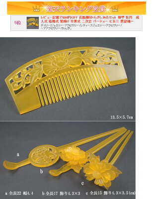 (品質表示) 樹脂製(寸法表示) 前櫛:13.5×5.7cm 平簪:全長22cm 幅4.4cm 簪:全長17 4.3×3cm 簪:全長15 4.3×3.5cm(原産国) 日本この商品は箱入りにてお届けします。