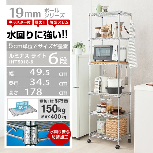 【キャスター付】ルミナス ラック スチールラック 幅50 奥行35 メタル ラック 棚 6段 業務用 収納ラック スチールシェルフ メタル 棚 シェルフ オープンラック キッチン収納棚 ライト IHT5018-6 (ST5035/PHT-0173SL)