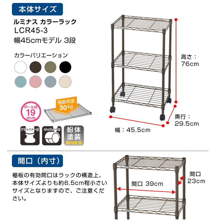 お気に入りカラーでお部屋に彩アクセント商品名/型番 ルミナス カラーラック 3段 幅45cmモデル LCR45-3カテゴリ ポール径19mm ルミナス カラーラック分 類スチールラック カテゴリカラーラックサイズ 幅45.5×奥行29.5×高76cm※高さはナイロンキャスター取付時の高さです。